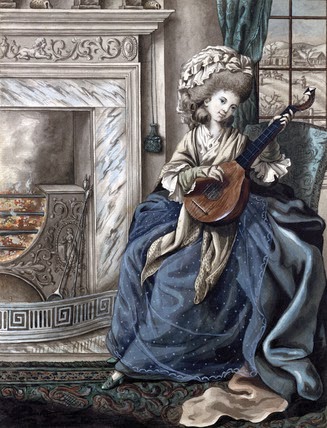 A woman is playing a lute in front of the fire to warm herself up. The weather hasn't gotten any warmer. The landscape outside the window is covered in snow.