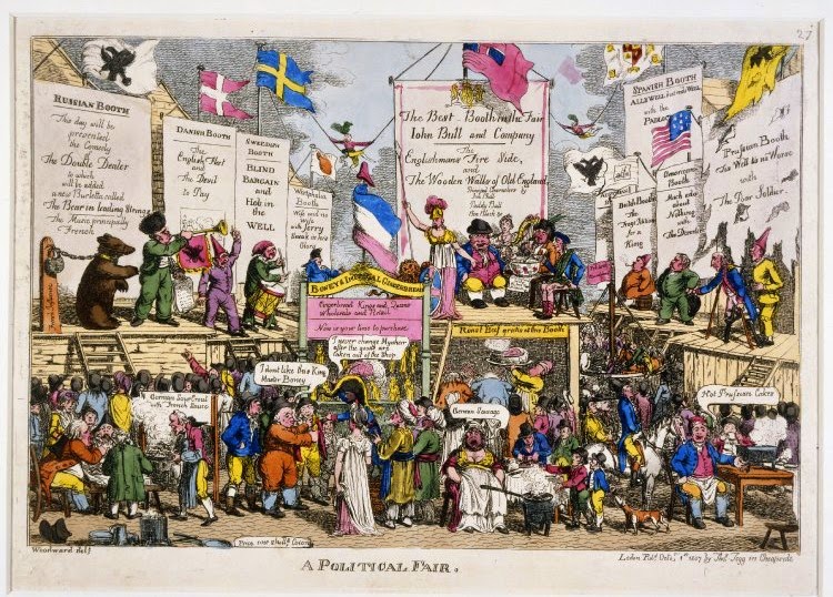 On the ground, the French booth is displaying a large tricolour flag surmounted by the cap of Liberty. The inscription reads: "Boneys Imperial Gingerbread, Gingerbread Kings and Oueens Wholesale and Retail, Now is your time to purchase." A Dutchman is complaining about his purchase, saying "I don't like this King Master Boney". Napoleon replies: "I never change Mynheer after the goods are taken out of the Shop".